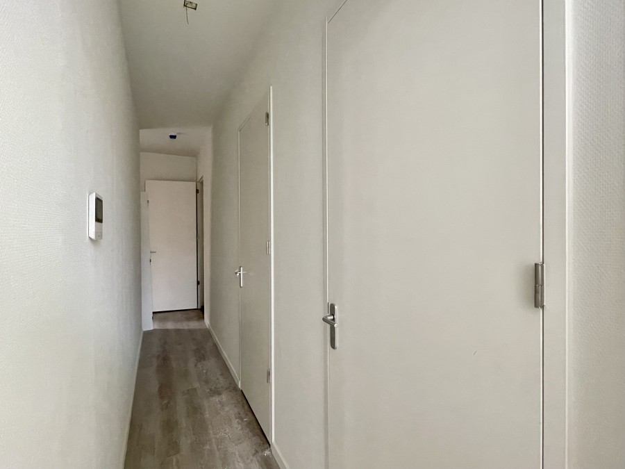 Bij binnenkomst word je verwelkomd in een hal met een separaat toilet. De badkamer, voorzien van wastafel en douche, bevindt zich ook in deze hal. De woonkamer geniet van veel natuurlijk licht dankzij de grote ramen. De open keuken draagt bij aan een ruimtelijk gevoel. De slaapruimte is afgescheiden door een glazen wand die afsluitbaar is. Hier bevindt zich tevens een (inloop) bergkast.
