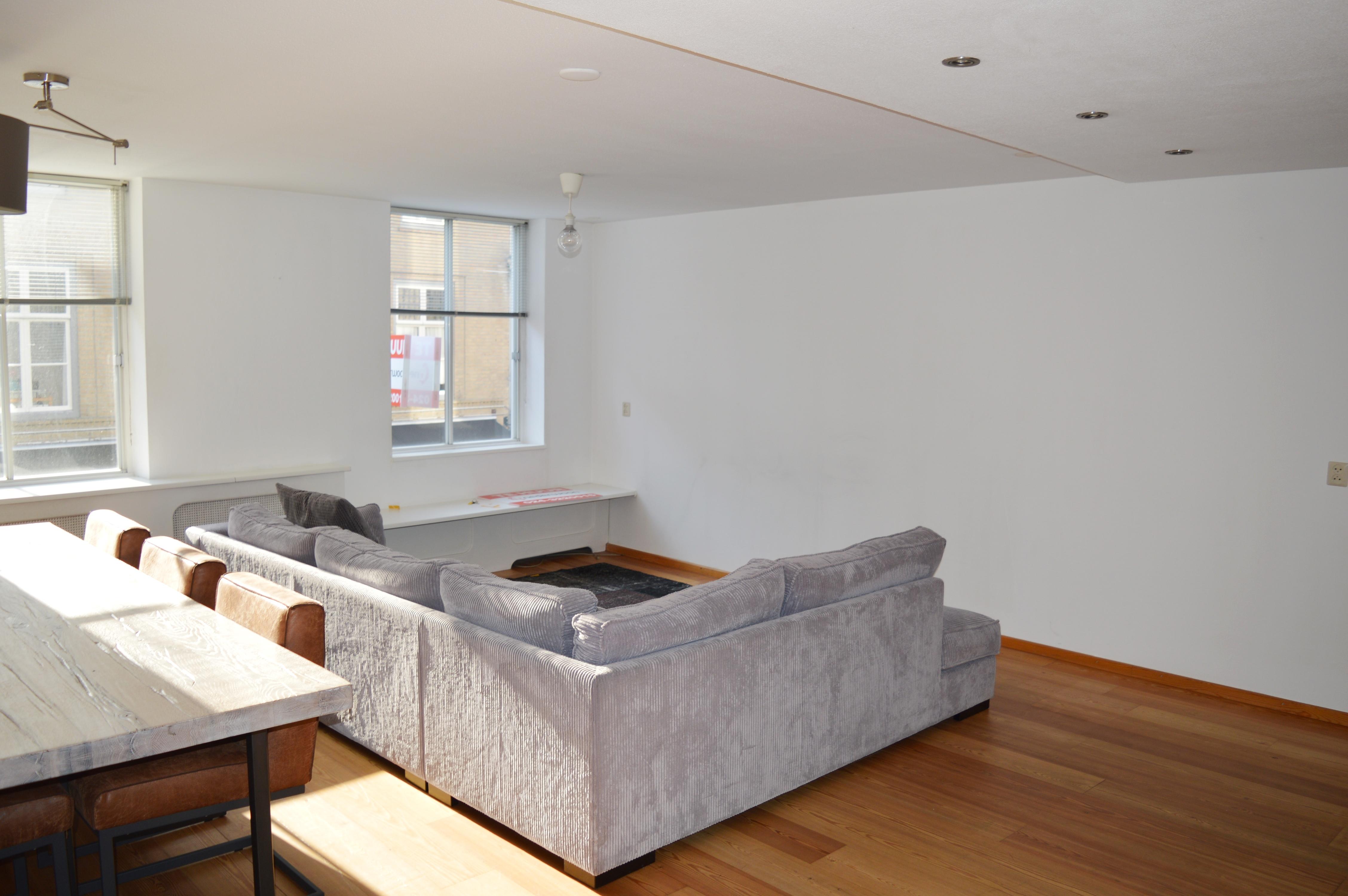 Achter de voor deur van het appartement treffen we de entree/hal met meterkast, het toilet en een fonteintje. Via een glazen deur komen we in de lichte, royale woonkamer, gelegen aan de voorzijde. Vanuit de kamer is er volop zicht op het levendige straatbeeld. De moderne lichte, open keuken is voorzien van een koelkast, gasfornuis, oven en een vaatwasser. De gehele woning is voorzien van een lichte houten vloer.