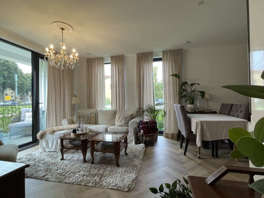De woonkamer heeft toegang tot het balkon en een luxe open keuken met alle benodigde inbouwapparatuur. Er zijn twee slaapkamers van respectievelijk 8m² en 10m². De kamers zijn voorzien van royale draaikiepramen. Frisse ruimtes vol daglicht en een comfortabel afwerkingsniveau.